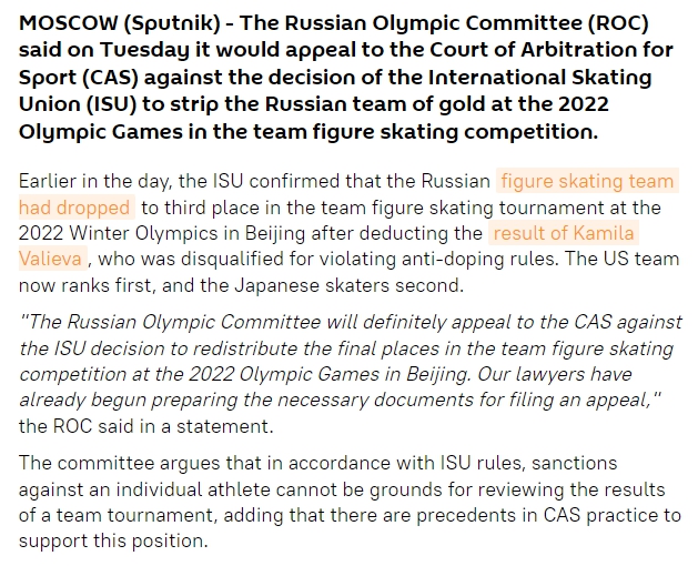 據俄羅斯衛星通訊社報道,俄羅斯奧委會也在當地時間30日表示,將針對俄羅斯花滑運動員卡米拉·瓦利耶娃被處以禁賽并取消北京冬奧會俄羅斯奧委會代表團花滑團體金牌一事,向國際體育仲裁法庭提起上訴。