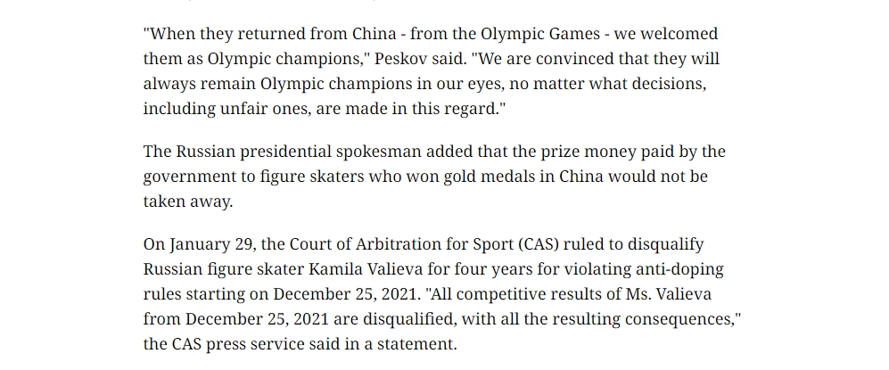 據塔斯社報道,佩斯科夫表示,無論國際體育組織作出什么決定,俄羅斯人會永遠將卡米拉·瓦利耶娃和其他花樣滑冰運動員視為冬奧冠軍。