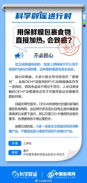 中新網(wǎng)1月31日電 在正規(guī)渠道購買的,包裝上明確表示可以用于微波爐加熱的保鮮膜,通常是安全的。提到保鮮膜,大家可能會想到致癌的“增塑劑”。含有DEHP增塑劑的PVC保鮮膜確實存在一定風險,但其余品類不用過于擔憂。(來源:@科學辟謠 中國新聞網(wǎng)微博)