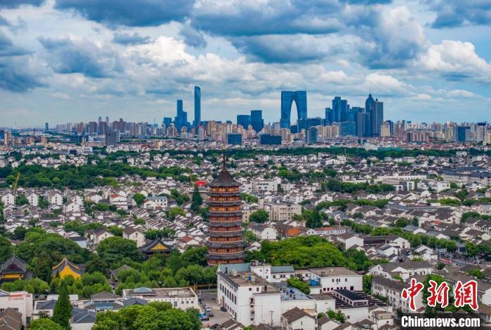 資料圖:蘇州古城近處的北寺塔與遠處的現代樓宇相呼應。 泱波 攝