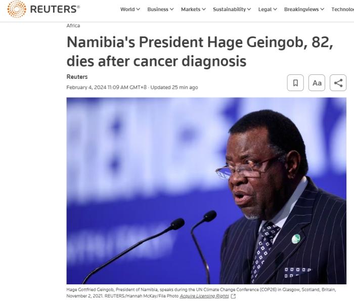 路透社稱,納米比亞共和國總統社交媒體賬號并未解釋該國總統去世的原因,但哈格·根哥布上月底曾表示,自己被診斷出患有癌癥,將前往美國治療。