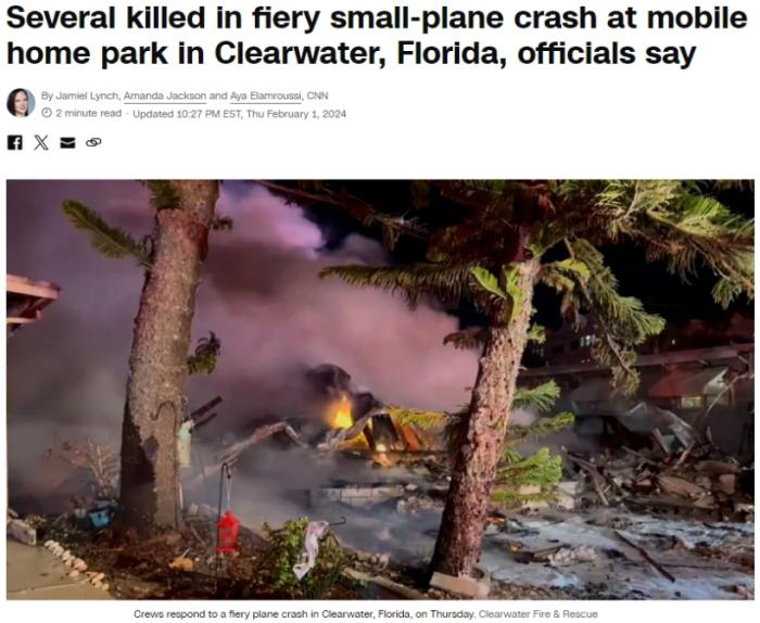 中新網2月2日電 據美國有線電視新聞網(CNN)報道,當地時間2月1日晚,一架小型飛機在美國佛羅里達州克利爾沃特市的一處公園墜毀。