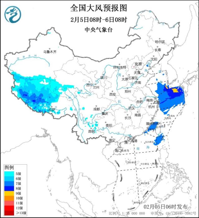 中央氣象臺2月5日06時繼續發布大風藍色預警:預計,2月5日08時至6日08時,西藏中西部、青海西南部等地將有5~7級、陣風8級的大風;黃海南部海域、東海大部海域、臺灣海峽、巴士海峽將有7~8級、陣風9級的大風,其中黃海東南部、東海東北部的部分海域風力可達9級、陣風10級。