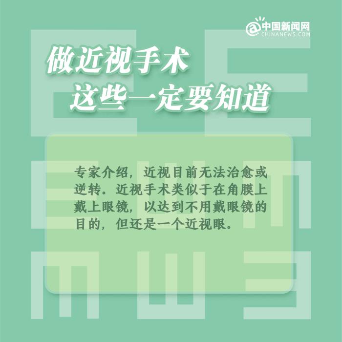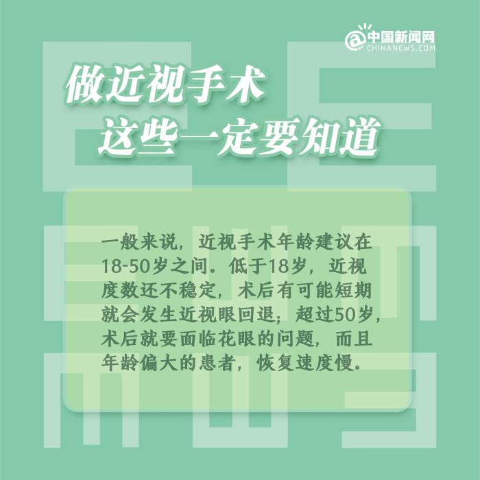 中新網2月4日電 ①近視手術,分為角膜激光手術和眼內鏡植入手術;②一般來說,近視手術的時間建議在18-50歲之間;③術后1個月內,避免異物進入眼睛,不要揉眼和劇烈運動;④術后仍應注意用眼衛生、飲食習慣、生活習慣等,要經常放眼遠眺。