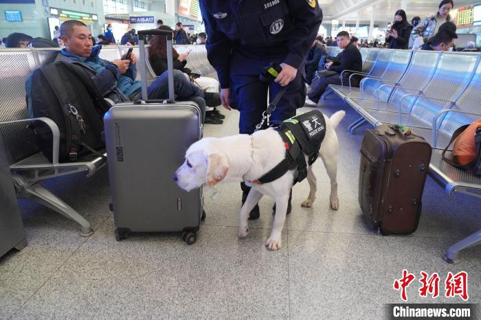 站崗一個小時后,訓導員帶著它到站內(nèi)開展巡邏,安檢口、候車室、檢票口、站臺等區(qū)域,都是他們要巡邏的重點部位。