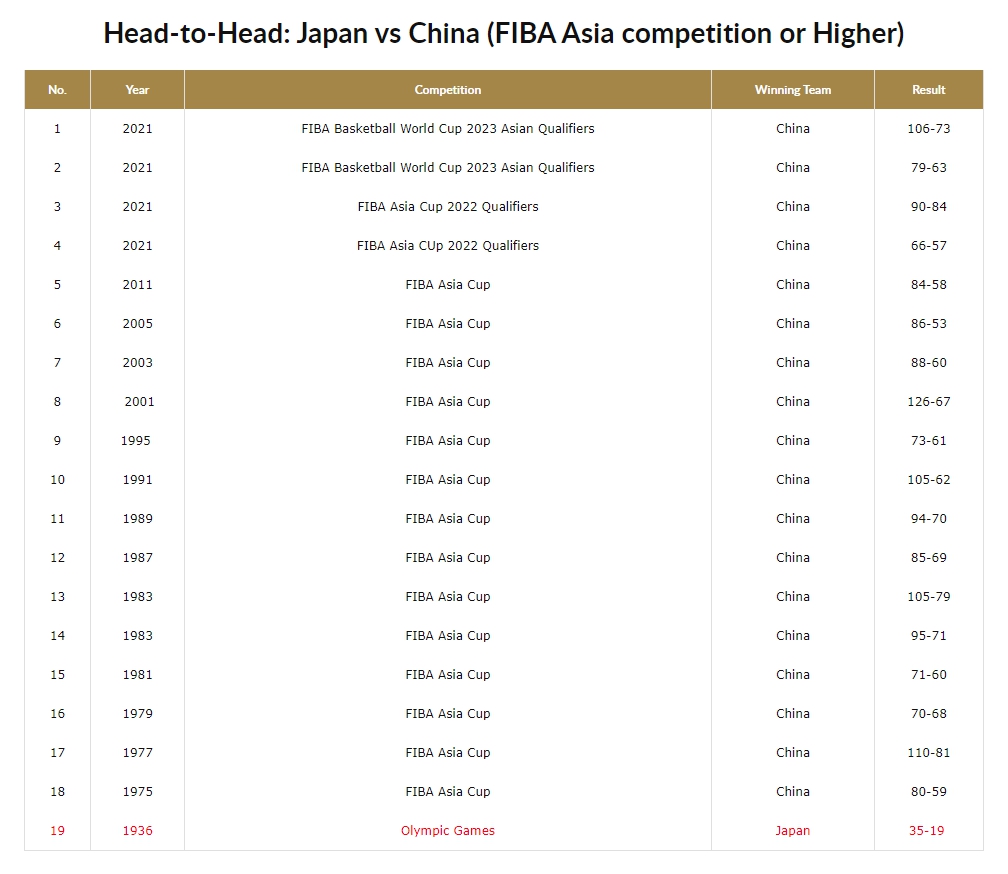 據國際籃聯統計,自1936年奧運會以來,中國男籃從未在FIBA國際籃聯舉辦的亞洲杯及更高級別比賽中負于日本男籃。