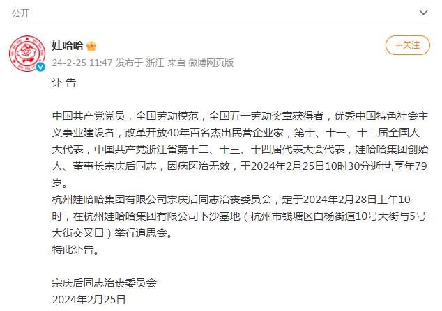 中新網2月25日電 據娃哈哈集團官方微博消息,娃哈哈集團創始人、董事長宗慶后因病醫治無效,于2024年2月25日10時30分逝世,享年79歲。