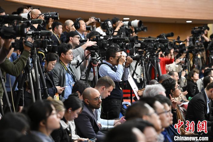 3月6日,十四屆全國人大二次會議在北京舉行記者會,國家發展和改革委員會主任鄭柵潔、財政部部長藍佛安、商務部部長王文濤、中國人民銀行行長潘功勝、中國證券監督管理委員會主席吳清就發展改革、財政預算、商務、金融證券等相關問題回答中外記者提問。圖為中外記者在現場采訪?!≈行律缬浾?何蓬磊 攝