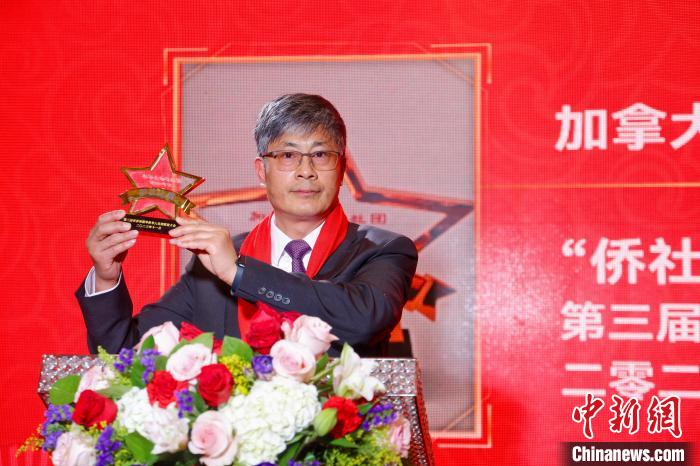 當地時間3月8日晚,加拿大福建社團聯合總會在多倫多舉辦2024甲辰龍年迎春團拜會。圖為該會主席林慶清在致辭時展示2023年11月第三屆世界閩籍華僑華人社團聯誼大會向加拿大福建社團聯合總會頒授的“僑社之星”獎杯。 中新網記者 余瑞冬 攝