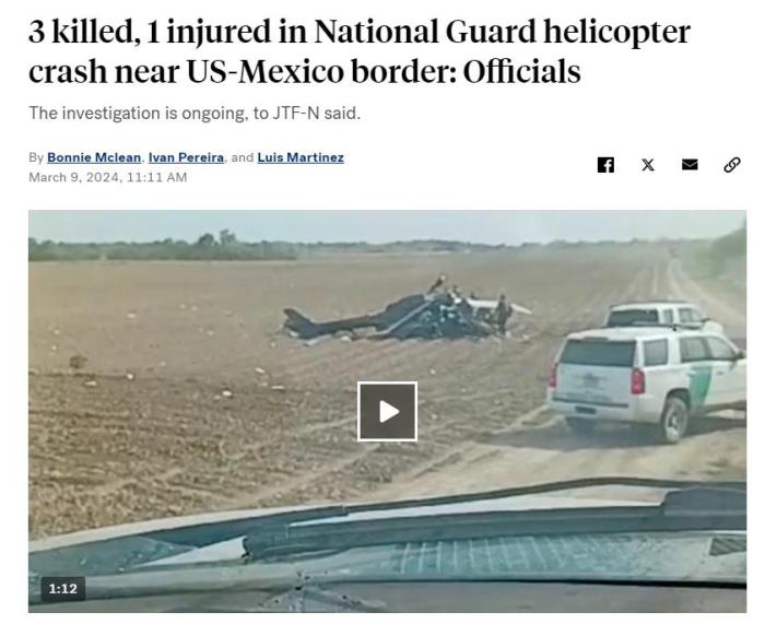 中新網3月9日電 據美媒報道,當地時間3月8日,一架美國國民警衛隊直升機在美墨邊境附近墜毀,造成3人死亡、1人受傷。