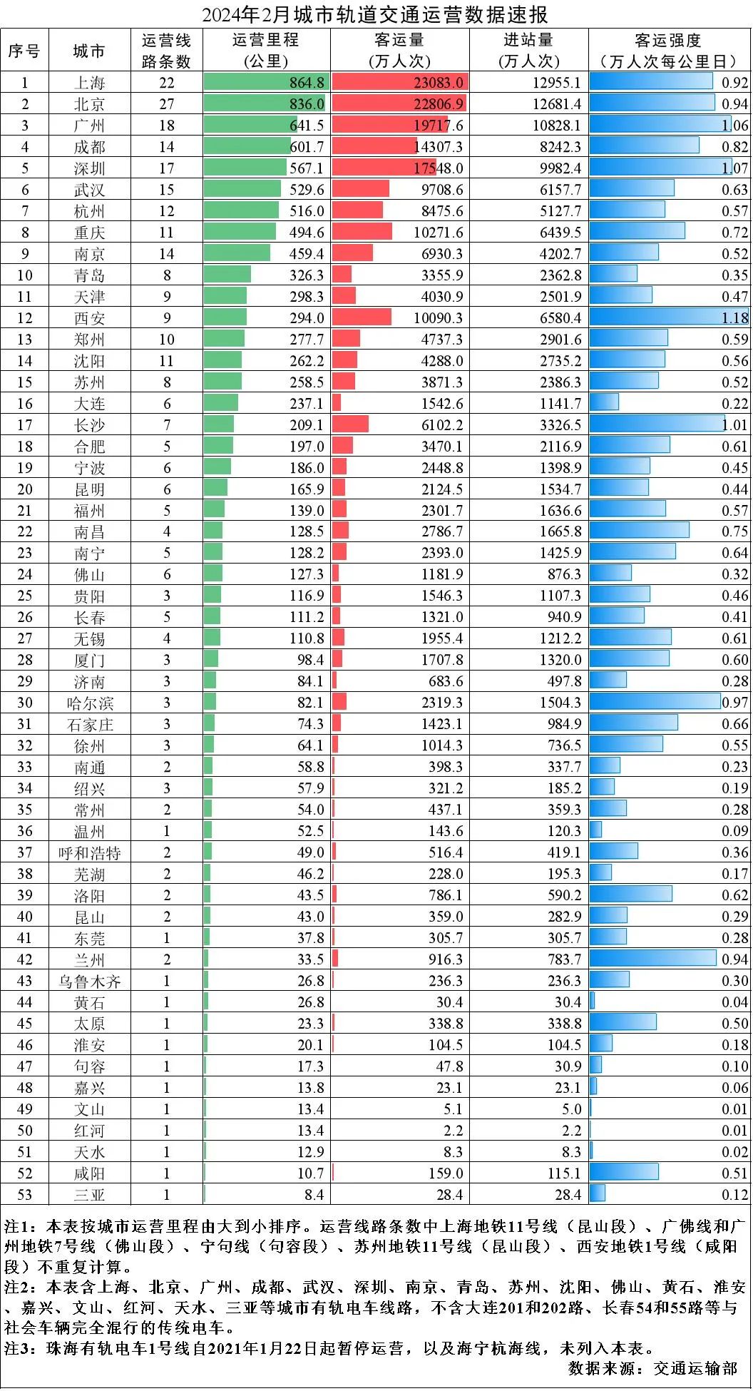 其中,地鐵、輕軌、市域快速軌道等大運量線路共267條,運營里程9499.8公里,完成客運量20.1億人次,進站量12.1億人次;單軌、磁浮等中運量線路共7條,運營里程202.5公里,完成客運量3175萬人次,進站量2304萬人次;有軌電車、自動導向軌道等低運量線路共34條,運營里程503.3公里,完成客運量888萬人次,進站量851萬人次。(中新財經)