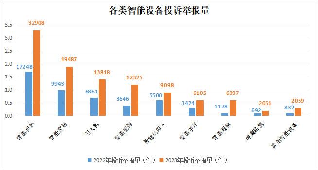 隨著物聯網、人工智能、5G通信等技術的突破,智能設備不斷更新迭代。各類可穿戴智能設備、智能家居越來越受到消費者的青睞,相關消費糾紛增長較快。2023年,全國12315平臺共接收智能設備投訴舉報10.4萬件,同比增長1.1倍。其中智能手表(3.3萬件)、智能家居(1.9萬件)投訴舉報較多;智能眼鏡、智能配飾類別增長較快,分別同比增長4.2倍、2.4倍。消費者反映問題主要集中在售后服務困難、泄露消費者個人信息、產品實際功能與宣傳不符等。