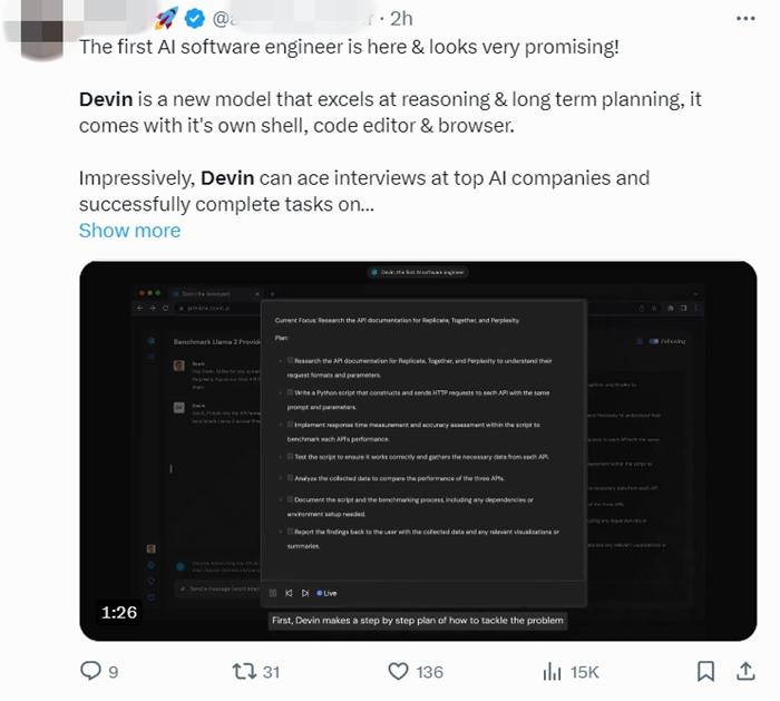 “第一位AI工程師看起來很有希望,令人印象深刻的是,Devin可以在頂級AI公司的面試中脫穎而出,并且成功地完成了任務。”有人工智能專家在社交平臺分享觀點。多個Devin編程的視頻也在網絡流傳。