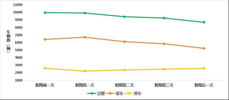 預計清明假期,普通公路日均斷面交通量約9550輛,假期前一天與第一天交通量相對較高,隨后有所下降。