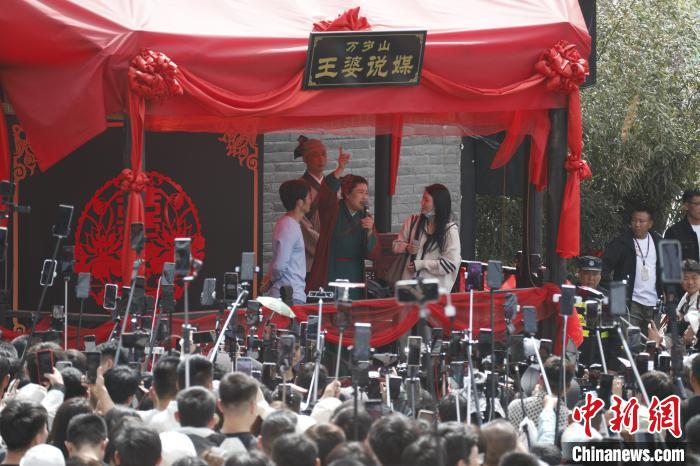 在“王婆說媒”現場,中新網記者看到人山人海的游客以年輕人居多,“王婆”扮演者趙梅因口才、表演力、控場等功底詼諧幽默,深受到年輕人追捧,她不時插科打諢、即興歌舞,引得現場陣陣歡呼。