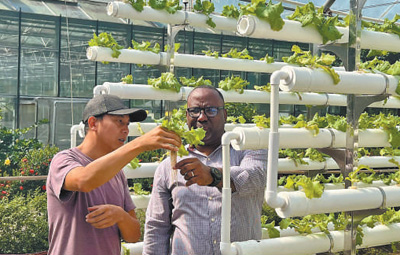 中國援多米尼克農業技術合作項目始于2005年,目前已開展至第八期。項目引進了多個高附加值農作物品種,促進了多米尼克農業產業升級。圖為中多兩國農業專家在觀察水培系統種苗生長情況。