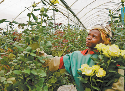 近年來,鮮花是肯尼亞出口中國的主要農產品之一。圖為在肯尼亞奈瓦沙湖畔的一家鮮花農場,一名花農正在采摘鮮花。