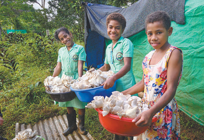中國政府面向斐濟等太平洋島國推廣菌草技術,推動當地經濟發展,助力當地民生改善。圖為在斐濟奈塔希里乳業婦女組織菌草技術示范點,孩子們正在幫忙采菇。