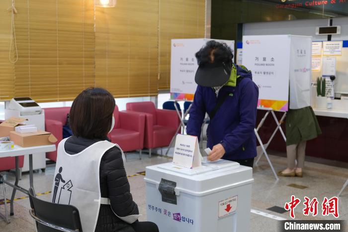 韓國第22屆國會議員選舉4月10日舉行,各政黨候選人將角逐國會300個議席。圖為首爾市廣津區一處投票站內,選民將選票投入票箱。中新社記者 劉旭 攝