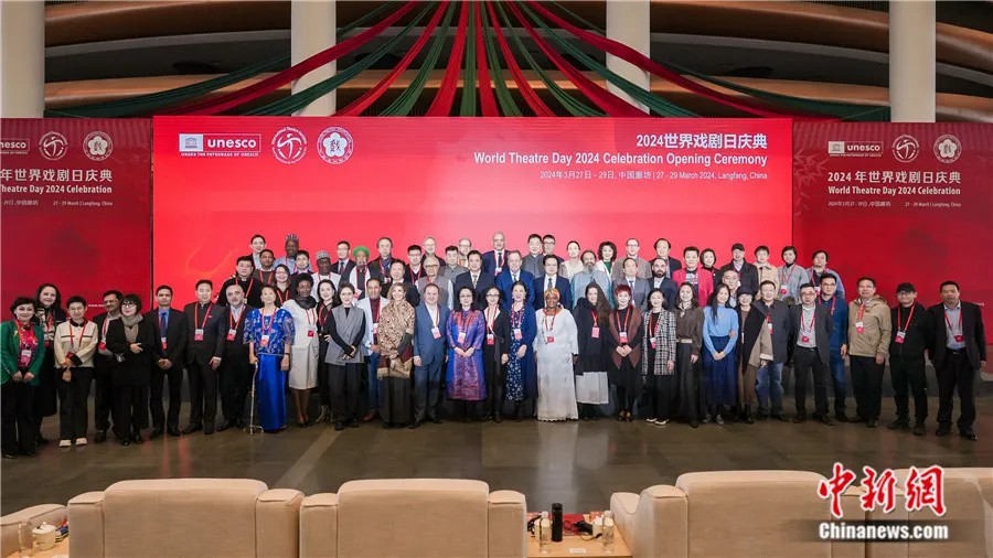 2024年3月27日,在河北廊坊參加2024年世界戲劇日慶典活動的中外嘉賓合影留念。活動主辦方供圖