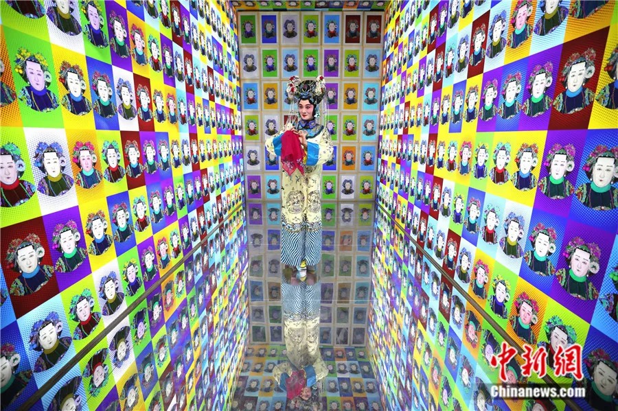 在2022年中國國際服務貿(mào)易交易會上,經(jīng)過數(shù)字技術再創(chuàng)作的戲劇人物形象,吸引一名京劇演員駐足。趙雋 攝