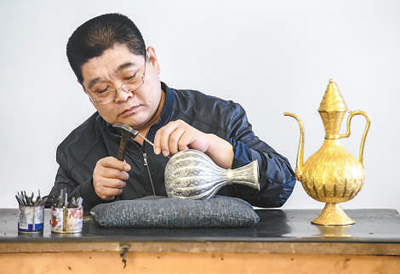 “我第一次制作花絲工藝品是在17歲。”馬福良的父親一直從事花絲工藝品的制作。耳濡目染之下,馬福良也慢慢入了行。花絲鑲嵌眾多工藝中,他最喜歡的是鏨刻。“別看只是用錘子敲打鏨子,這里面講究可多了。”下錘的力度、發力的角度都要根據材質的薄厚、圖案起伏的高低不斷調整。鏨刻中,最費心思的是鏨子。“三分手藝,七分家伙兒。要想成品好,家伙兒必須行。”每次制作新作品,馬福良總要先花大量時間研究工具,根據圖案的紋路,制作不同形狀的鏨子。多年來,馬福良制作及使用的鏨子已近400個。