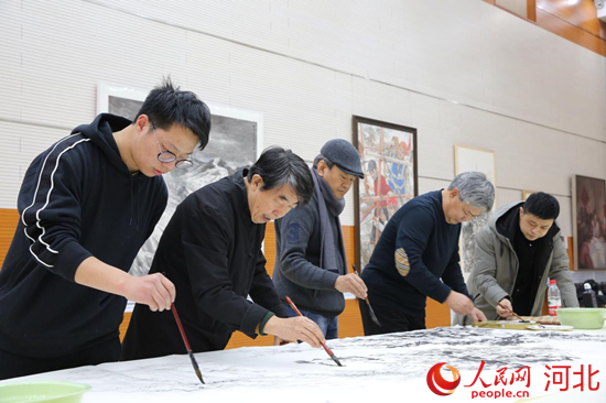 人民網(wǎng)石家莊1月6日電 由“為奧運喝彩”組委會主辦的“百名畫家繪冬奧”活動5日走進河北。河北省20余名當?shù)厮囆g(shù)家現(xiàn)場揮毫潑墨,合作創(chuàng)作了三幅奧林匹克題材的中國畫作,喜迎即將到來的冰雪盛會。