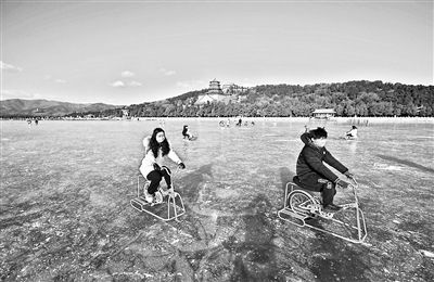 頤和園冰場(chǎng)的景色絕佳,冰場(chǎng)四周環(huán)繞著頤和園的亭臺(tái)樓閣,游客在冰面滑行的過(guò)程中,可切身感受到古人造園“步移景異”的精妙之處。冰上賞景的最佳選擇是騎行冰上自行車,冰上自行車幾乎對(duì)技術(shù)零要求,因?yàn)橛薪饘倏蚣艿闹危T行時(shí)比普通自行車還要平穩(wěn),冰上自行車可快可慢、可停可站,游客呼吸著清冽的空氣,眼前則是高大雄偉的佛香閣與遼闊的西山群峰,盡管腳下在奮力地蹬車,在不知不覺(jué)間已融入到頤和園的山水畫(huà)卷之中。