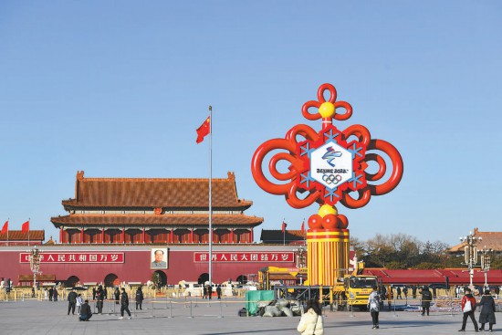 昨天,天安門廣場又添新景。一個鑲嵌有2022冬奧會會徽的巨型中國結正在安裝。中國結整體呈紅色,中心鑲嵌一片藍白相間的雪花,雪花正中是2022冬奧會會徽,為迎接春節和冬奧營造喜慶氛圍。 本報記者 鄧偉攝