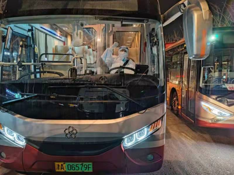 天津公交集團派出人員、車輛做好防范區以內人員轉運和交通保障工作。天津市國資委黨委宣傳處供圖