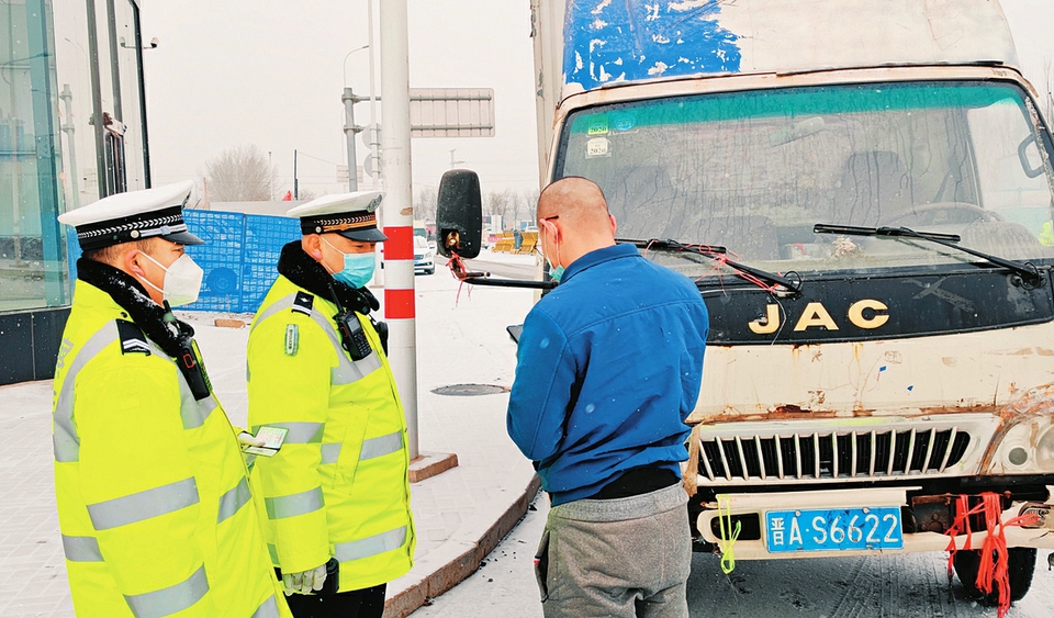 由于連日下雪,為有效預防道路交通事故的發生,太原鐵路公安處交警支隊及時啟動惡劣天氣應急預案,全員上崗,積極應對降雪天氣,確保旅客“春運”平安出行。圖為1月24日,民警上街排查交通安全隱患。(成鵬攝)