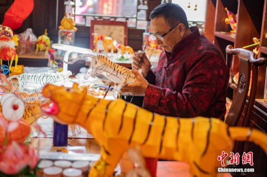 1月24日,南京秦淮花燈傳承藝人曹真榮正在趕制以“虎”為主題的花燈。隨著農歷虎年春節的臨近,南京老城南一帶的民間花燈藝人加班加點趕扎花燈,迎接春節的到來。 中新社記者 泱波 攝