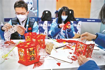 昨天是中國的傳統節日元宵佳節,國家體育館開展了豐富多彩的慶祝活動,當天場館餐廳提供了湯圓,場館禮賓部工作人員向外賓介紹中國吃湯圓的由來和寓意,并邀請大家品嘗。在志愿者之家內,彩燈高懸,充滿歡聲笑語,志愿者們做燈籠、猜燈謎,共同度過一個歡樂祥和的元宵節。圖為冬奧志愿者在制作花燈。文并攝/本報記者 黑建軍
