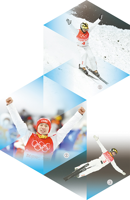 圖①:2月16日,齊廣璞在自由式滑雪男子空中技巧決賽中穩穩落地。