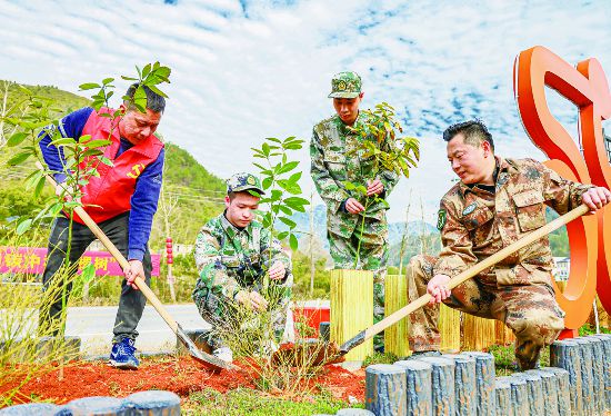 近日,在即將奔赴軍營前夕,金華婺城區莘畈鄉兩名應征入伍的青年,積極參加鄉里組織的植樹活動,將一棵棵樹苗種進土壤,也在心中種下保衛祖國、報效祖國的種子。(吳潮宏)