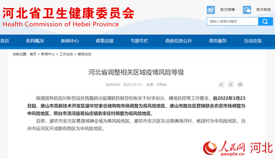 人民網石家莊3月23日電 據河北省衛健委發布的最新消息,根據國務院應對新型冠狀病毒肺炎疫情聯防聯控機制關于科學劃分、精準防控等工作要求,自2022年3月23日起,唐山市高新技術開發區盛華世家倉儲購物市場調整為高風險地區,唐山市路北區君瑞聯合農貿市場調整為中風險地區,邢臺市清河縣葛仙莊鎮袁宋莊村調整為低風險地區。
