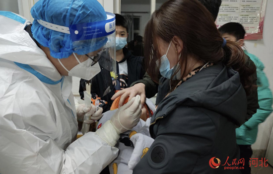 3月18日,海興縣小山鄉(xiāng)9個(gè)月大的寶寶被媽媽抱著接受核酸檢測(cè)。 梁妍婧攝