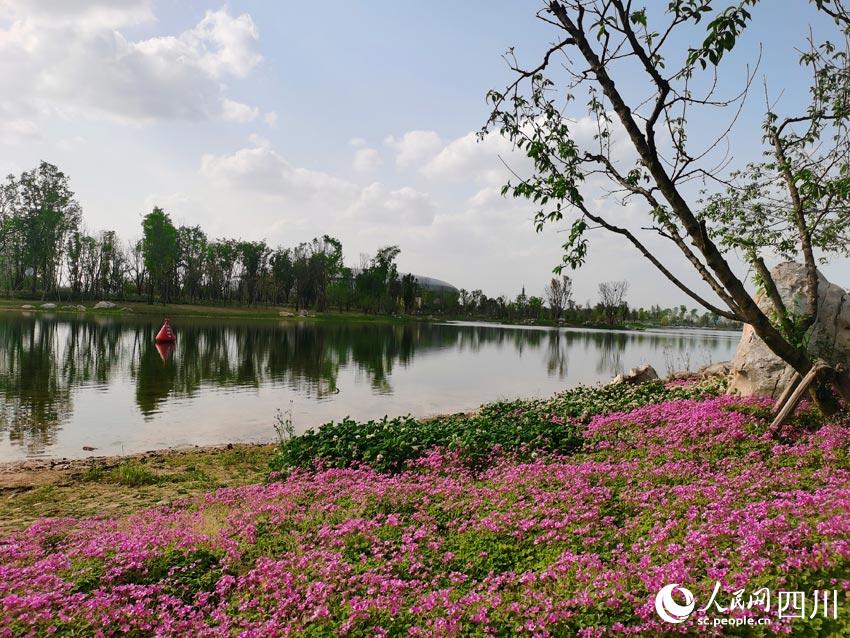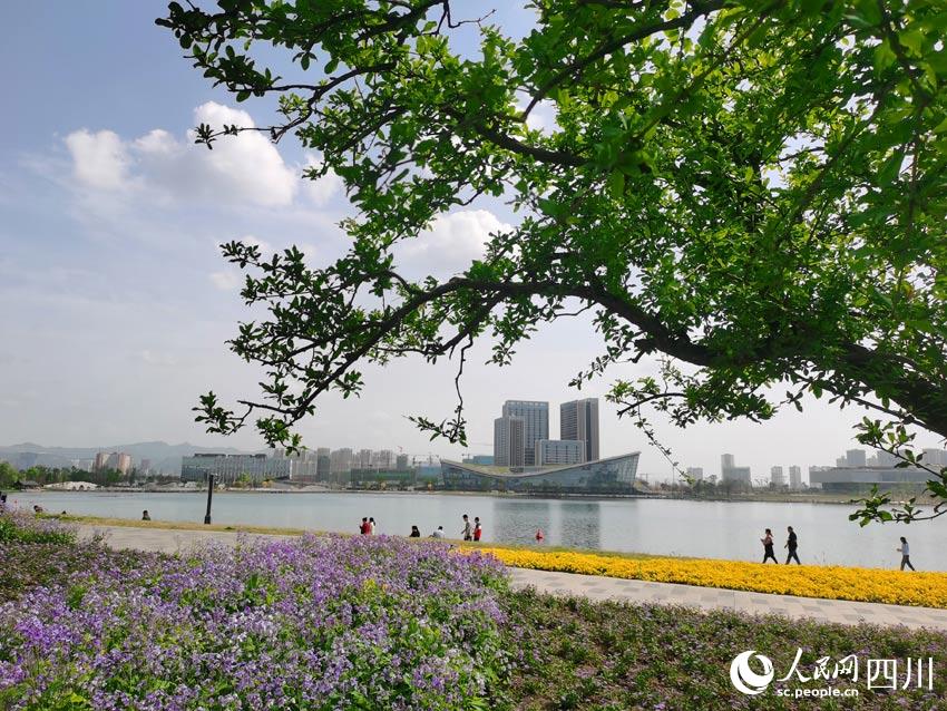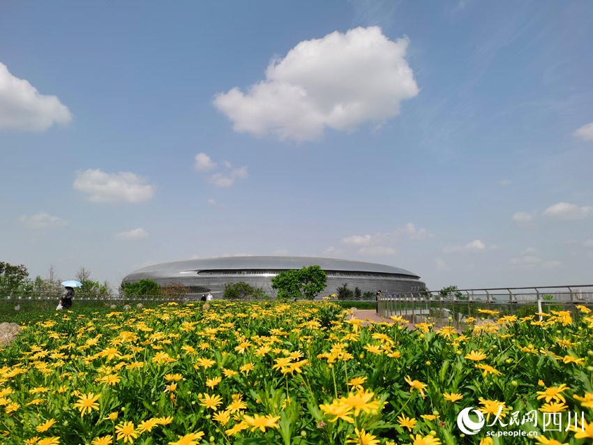 龍泉山脈綿亙遠方,東安湖水蕩漾眼底,體育場館巍峨半空,花草樹木各展春姿。在湖光山色之間,有大量市民前來踏青賞春,順便欣賞著大運會場館和火炬塔的風采。