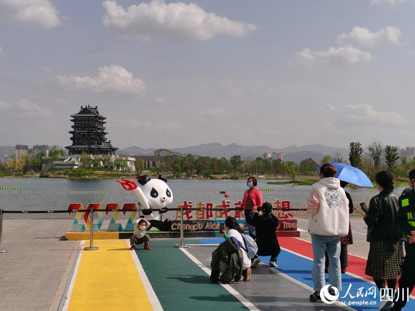 “2022,成都成就夢想!”一個大熊貓手持大運會火炬的雕塑造型旁,寫著這句話,吸引了不少游人在這里打卡拍照。2022年,成都成就的不只是大運會運動員們的夢想,還有更多熱愛生活、熱愛體育的人的夢想。