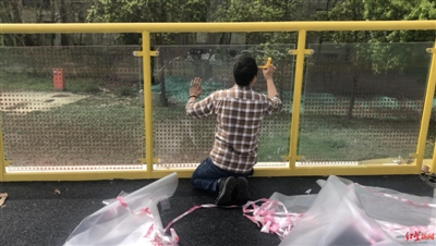 該座天橋大約有三分之一的玻璃護欄已經貼上了膜。未貼膜的玻璃護欄有的橫著拉了兩條“警戒線”,有的拉了三條。“要不了多久就能貼完了”,現場工作人員表示,“警戒線”是臨時措施,貼完膜就會取掉。