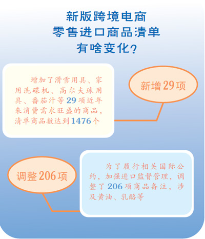 此次調整,在《跨境電子商務零售進口商品清單(2019年版)》基礎上,增加了滑雪用具、家用洗碟機、高爾夫球用具、番茄汁等29項近年來消費需求旺盛的商品,涉及食品、家用電器、運動用品等多類別,清單商品數達到1476個。