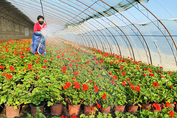 花農在廣陽區北旺鎮相士屯村盛園花卉種植基地,為天竺葵澆水。 蘇克怡攝