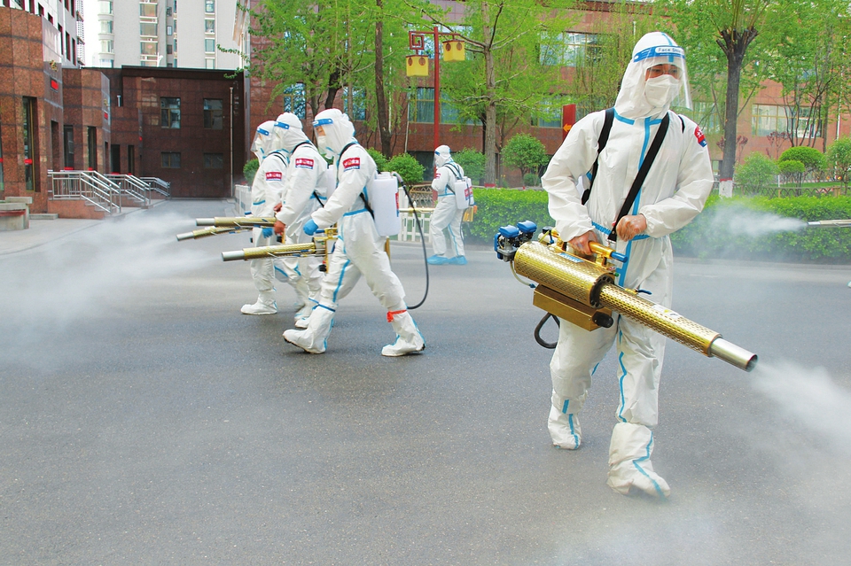 4月12日,在小店區千禧學府苑小區,太原市應急管理綜合行政執法支隊的消殺隊員們正在消殺。隨后他們來到西吳村社區、丁香園、恒大綠洲、長風小區等居民住宅區,對所有樓棟、垃圾點及室外公共區域等進行全面消殺,牢牢筑起健康防線。(記者尤麗云攝)
