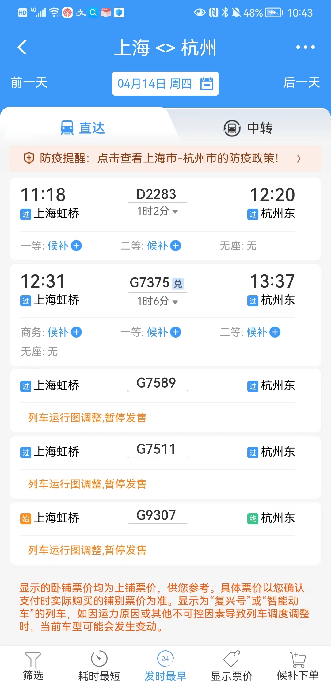 以查詢4月14日上海-杭州的火車票為例,僅剩的5趟列車中,D2283、G7375只是從上海虹橋站經過,車票售罄是因為買票的幾乎都是別的城市上車的旅客,實際從虹橋站上車的旅客幾乎沒有;另外兩趟在上海虹橋站的過路車(G7589、G7511)和一趟始發車(G9307)干脆已暫停發售車票,更不存在大量上海出發旅客買票的可能。