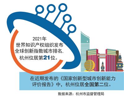 2021年以來,杭州知識產權工作堅持以數字化改革為引領,以推動高質量發展為目標,著力完善體系,持續協同發力,為高質量發展建設共同富裕示范區城市范例提供了有力支撐。截至2021年底,杭州市有效發明專利擁有量9.5萬件,居全國省會城市第一,其中,高價值發明專利39842件,占比41.9%;杭州市有效注冊商標102.56萬件,居全國省會城市第二;2021年浙江省設區市知識產權保護工作考核優秀,位居第一;2021年世界知識產權組織發布全球創新指數城市排名,杭州位居第21位;在近期發布的《國家創新型城市創新能力評價報告》中,杭州位居全國第二位。