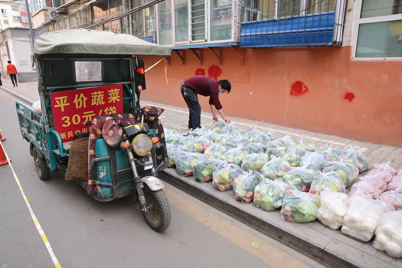 下午4:50,前來買菜的居民早已在杏花嶺區新民東街蔬菜供應點排隊等候。“每包30元,今天除了蔬菜,還給大家帶了些雞蛋和饅頭。”志愿者張君研說。