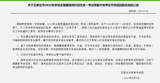 關(guān)于石家莊市2022年參加全國普通高校招生統(tǒng)一考試滯留外地考生盡快返回報(bào)名地的公告