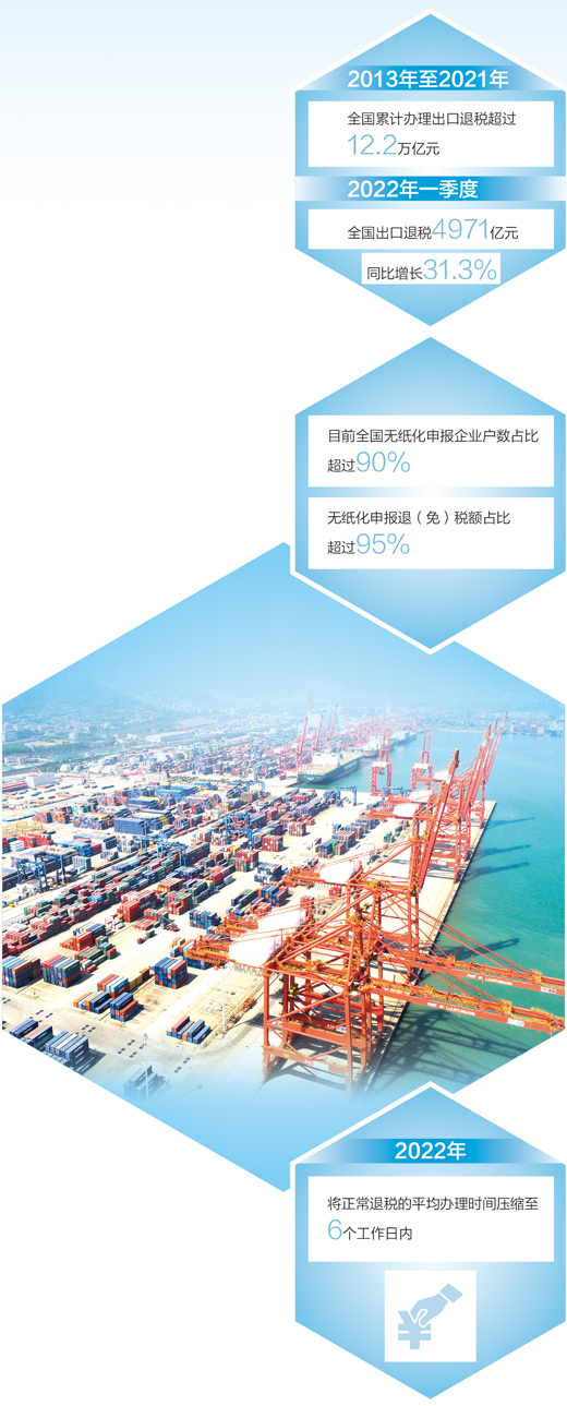 近年來,稅務總局持續擴大無紙化申報覆蓋范圍,大幅減輕出口企業申報負擔。目前,全國無紙化申報企業戶數占比超過90%,無紙化申報退(免)稅額占比超過95%;稅務總局正會同相關部門研究推出進一步提高出口退稅便利度等支持舉措,2022年內,正常退稅的平均辦理時間將壓縮至6個工作日內。