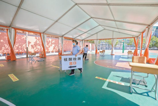 用紅色遮陽棚搭建在操場上的室外休息區,下午考試結束后將變身核酸檢測區。 本報記者 潘之望攝