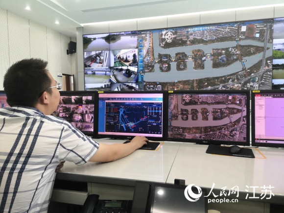 “我們現在觀察的是江都東閘引水情況、寶應泵站機組運行情況。”在江都水利樞紐南水北調江蘇集中控制中心,屏顯數字不時跳動變化,反饋著調水情況。據中心負責人介紹,這是南水北調江蘇智能調度系統,通過運用云計算、大數據、物聯網等現代信息技術,建立動態監測網絡,不斷提高水量優化調度、遠程集中控制、智能管理決策、應急響應處置等水平。“主控制臺布置16臺工作站,可對江蘇境內南水北調新建工程的14座泵站、62臺主機組實時監控。”